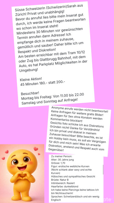Mein Inserat ist nur für Herren die sich gegenüber einer Dame zu benehmen wissen.Genug von Fake Girls, dann setze auf Schweizer Qualität! Ich bin leidenschaftlich, offen, herzlich und immer gut gelaunt. Ich habe eine erotische, weibliche Figur (nicht schlank aber Kurven an den richtigen Stellen) mit schönem Naturbusen. Hast du Lust auf ein sinnliches und erotisches Abenteuer ohne Hektik? Dann bist du bei mir genau richtig! Du möchtest deinem Alltag und dem Stress für eine Weile entfliehen? Komm zu mir und sei mein Gast. Meine Massagen werden für Dich ein berauschendes Erlebnis der Sinne werden und ich verstehe es gut Dich zu verwöhnen und eine entspannte Atmosphäre zu schaffen. Ich liebe es dich mit meinem Mund und meinen Händen zu verwöhnen, aber auch ich genieße es verwöhnt zu werden. Ältere Herren sind auch herzlich Willkommen!