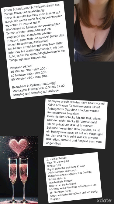 Mein Inserat ist nur für Herren die sich gegenüber einer Dame zu benehmen wissen.Genug von Fake Girls, dann setze auf Schweizer Qualität! Ich bin leidenschaftlich, offen, herzlich und immer gut gelaunt. Ich habe eine erotische, weibliche Figur (nicht schlank aber Kurven an den richtigen Stellen) mit schönem Naturbusen. Hast du Lust auf ein sinnliches und erotisches Abenteuer ohne Hektik? Dann bist du bei mir genau richtig! Du möchtest deinem Alltag und dem Stress für eine Weile entfliehen? Komm zu mir und sei mein Gast. Meine Massagen werden für Dich ein berauschendes Erlebnis der Sinne werden und ich verstehe es gut Dich zu verwöhnen und eine entspannte Atmosphäre zu schaffen. Ich liebe es dich mit meinem Mund und meinen Händen zu verwöhnen, aber auch ich genieße es verwöhnt zu werden. Ältere Herren sind auch herzlich Willkommen!