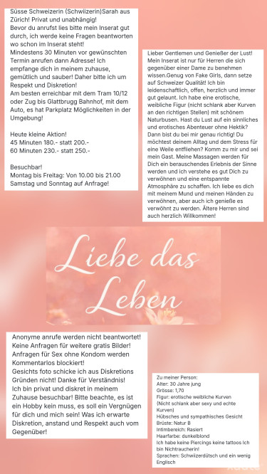 Mein Inserat ist nur für Herren die sich gegenüber einer Dame zu benehmen wissen.Genug von Fake Girls, dann setze auf Schweizer Qualität! Ich bin leidenschaftlich, offen, herzlich und immer gut gelaunt. Ich habe eine erotische, weibliche Figur (nicht schlank aber Kurven an den richtigen Stellen) mit schönem Naturbusen. Hast du Lust auf ein sinnliches und erotisches Abenteuer ohne Hektik? Dann bist du bei mir genau richtig! Du möchtest deinem Alltag und dem Stress für eine Weile entfliehen? Komm zu mir und sei mein Gast. Meine Massagen werden für Dich ein berauschendes Erlebnis der Sinne werden und ich verstehe es gut Dich zu verwöhnen und eine entspannte Atmosphäre zu schaffen. Ich liebe es dich mit meinem Mund und meinen Händen zu verwöhnen, aber auch ich genieße es verwöhnt zu werden. Ältere Herren sind auch herzlich Willkommen!
