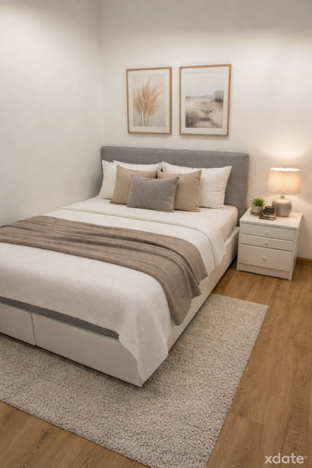 Cosy bedroom and a modern living room with sofa.