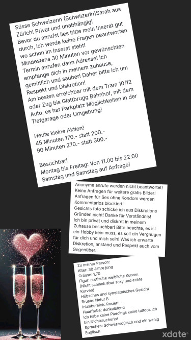 Mon annonce est réservée aux hommes qui savent se comporter avec une dame. Assez de fausses filles, alors mise sur la qualité suisse ! Je suis passionné, ouvert, chaleureux et toujours de bonne humeur. J'ai une silhouette érotique et féminine (pas mince mais des courbes aux bons endroits) avec une belle poitrine naturelle. Tu as envie d'une aventure sensuelle et érotique sans stress ? Alors tu es à la bonne adresse ! Tu veux échapper à ton quotidien et au stress pour un moment ? Viens chez moi et sois mon invité. Mes massages seront pour toi une expérience sensorielle enivrante et je sais très bien comment te gâter et créer une atmosphère détendue. J'aime te gâter avec ma bouche et mes mains, mais j'apprécie aussi d'être gâtée. Les hommes plus âgés sont aussi les bienvenus !
