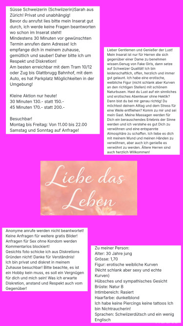 Il mio annuncio è solo per i gentiluomini che sanno come comportarsi con una donna, basta con le ragazze false, allora scegliete la qualità svizzera! Sono passionale, aperta, cordiale e sempre di buon umore. Ho un fisico erotico e femminile (non magro ma con curve nei punti giusti) con un bel seno naturale. Hai voglia di un'avventura sensuale ed erotica senza la confusione? Allora sei nel posto giusto! Vuoi fuggire dalla tua vita quotidiana e dallo stress per un po'? Venite da me e siate miei ospiti. I miei massaggi saranno un'esperienza inebriante per i vostri sensi e so come coccolarvi e creare un'atmosfera rilassata. Mi piace coccolarvi con la bocca e con le mani, ma mi piace anche essere coccolata. Anche i signori anziani sono i benvenuti!